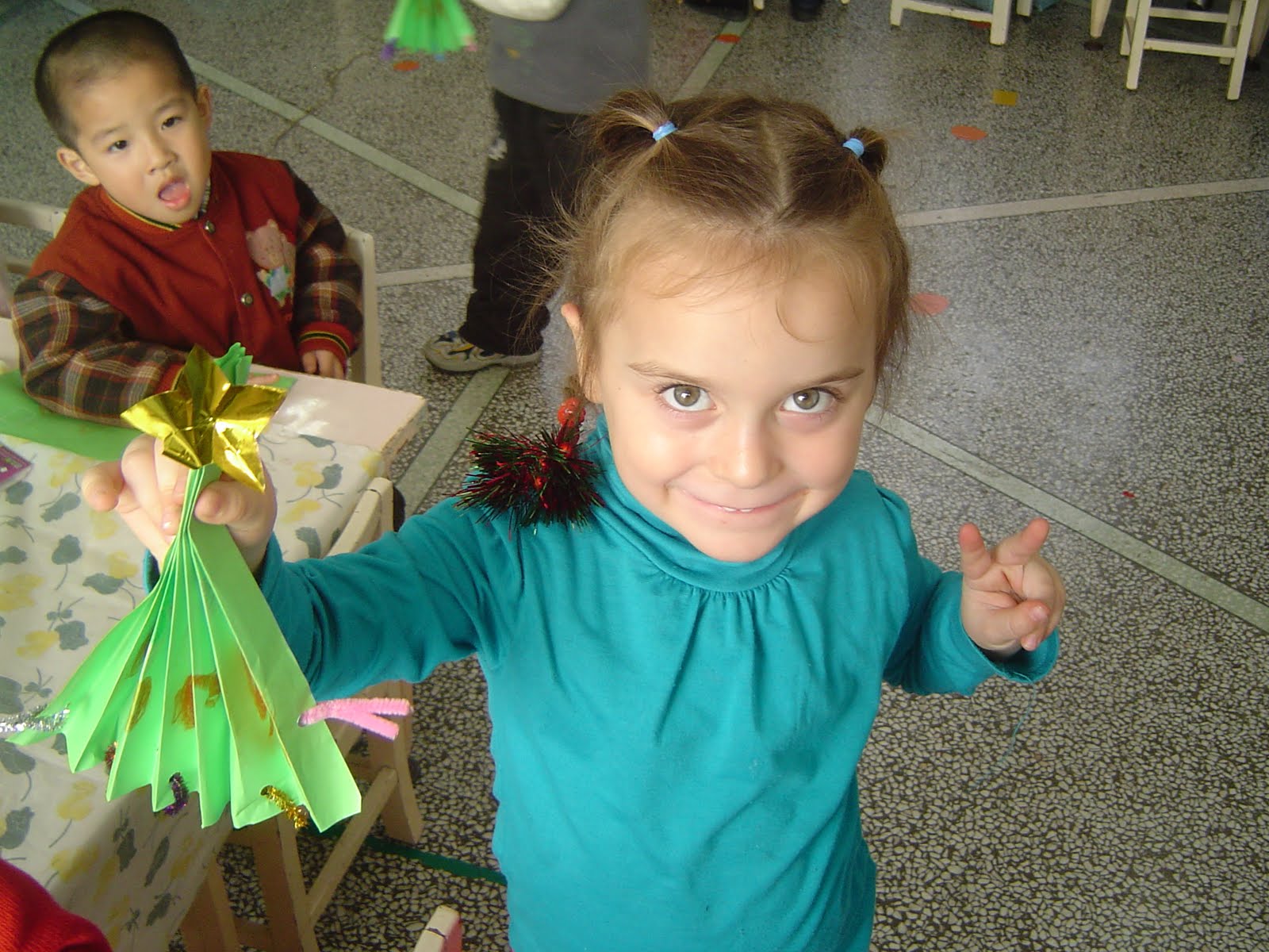 Alex is one of around forty students in her class and discipline is tight. Today's activity was making your own Christmas tree. After all sitting together in the middle of the room, they took their chairs back to their tables and started to work.